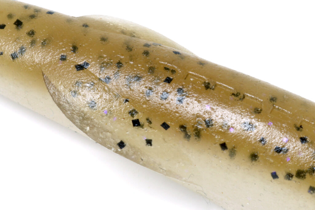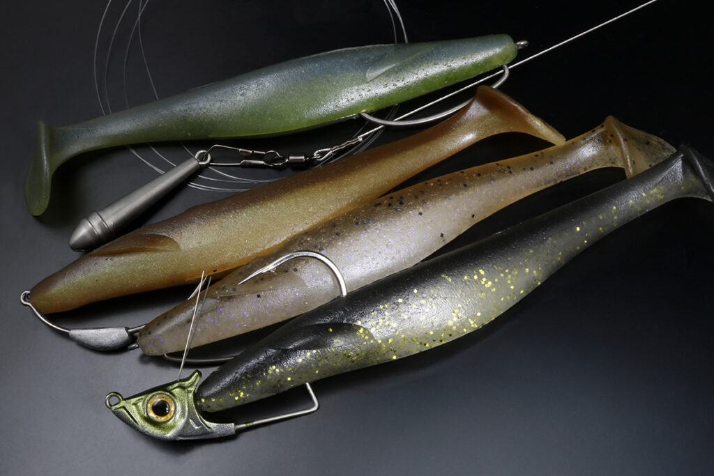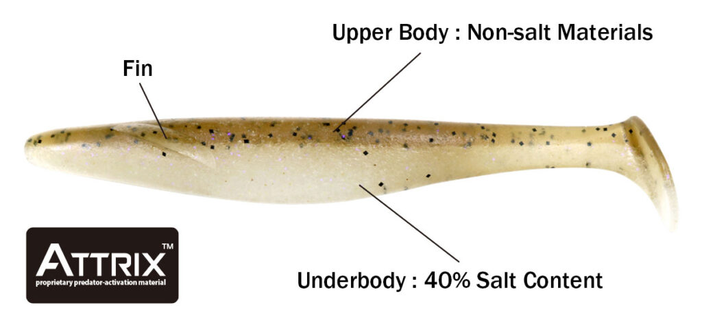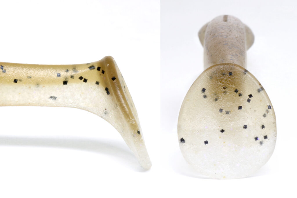 The lower plastic has a low center of gravity thanks to its high salt content, and the tail maintains a stable swimming posture. The design allows the tail to grip water easily, so it works well with fast and slow retrieves. It can be used several ways, draws fish from a long distance, and is easy to control the action, whether you fish it weightless, as a trailer on a swim jig, or drag it when rigged on a Texas-rig.